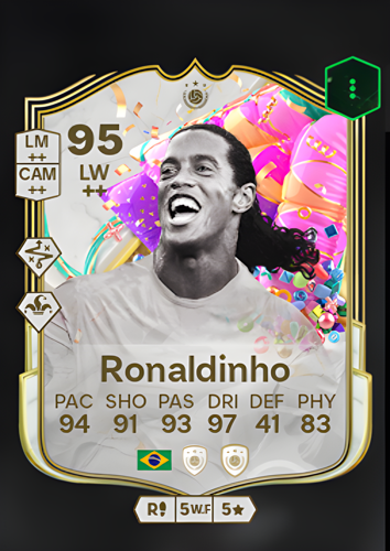 Ronaldo de Assis Moreira's Icon card shines as a Left Wing with an impressive overall rating of 95, making it one of the most coveted options for any squad. Boasting a blistering 94 pace, clinical 91 shooting, exceptional 93 passing, and an outstanding 97 dribbling, this card embodies the flair and creativity that defined the legendary Brazilian’s career. With these attributes, Ronaldo de Assis Moreira becomes a razor-sharp attacking threat on the wing, capable of slicing through defenses with ease, setting up teammates, or finishing chances himself. His high ratings ensure he can swiftly exploit gaps in the opposition, providing you with the perfect weapon to break deadlocks and secure crucial goals in tight matches.