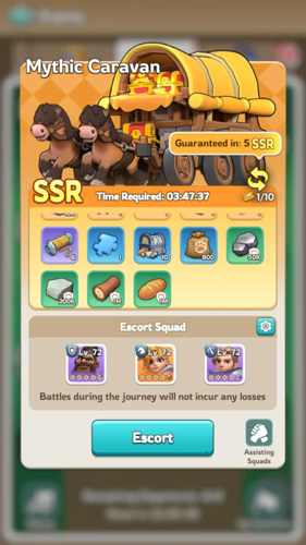 To safeguard your caravans, you can assign an alliance member to assist. This is done by clicking the “Assisting Squads” button located next to the escort option. Assistance can only be granted once per day per caravan.
