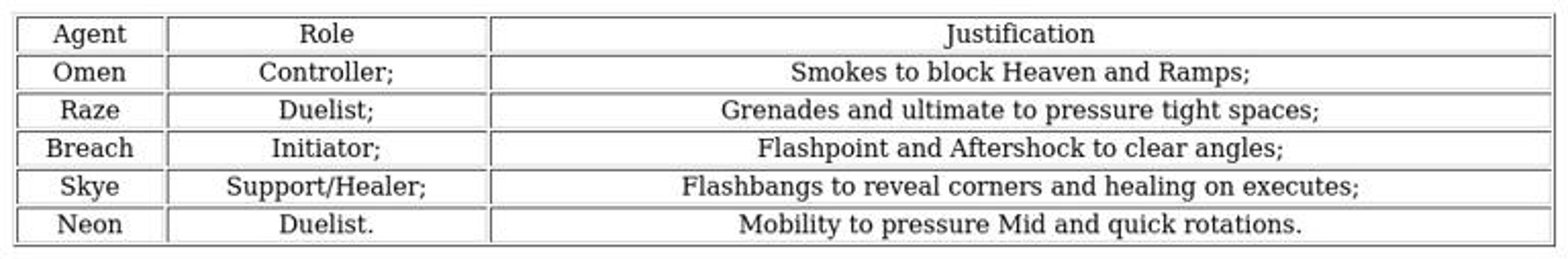 Les équipes attaquantes doivent composer avec des agents capables de percer la défense grâce à des entrées rapides, des stratégies de dissimulation de la vision et des distractions coordonnées. Raze, par exemple, excelle dans cet environnement grâce à ses grenades et à son ultime dévastateurs dans les espaces confinés, tout comme Neon, qui facilite les rotations rapides et la pression au centre avec ses murs d’énergie et sa vitesse accrue. Breach, quant à lui, est un initiateur incontournable pour percer les murs et déloger les défenseurs avec ses capacités de choc et de déstabilisation. Skye offre un avantage supplémentaire avec ses flashes guidés et ses soins, parfaits pour les prises de site en équipe. Enfin, Omen, maître des contrôleurs, utilise ses fumigènes pour bloquer les angles critiques et sa téléportation pour flanquer ou se repositionner rapidement.
