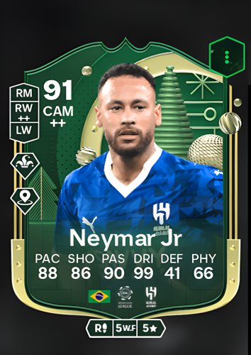 Neymar da Silva Santos Jr.'s Winter Wildcards card features him as a Central Attacking Midfielder with an impressive overall rating of 91, boasting standout attributes such as 88 pace, 86 shooting, 90 passing, and an exceptional 99 dribbling. While his defensive and physicality ratings are lower, at 41 and 66 respectively, his attacking prowess more than compensates for these areas. As a CAM, Neymar's sharp acceleration, precise passing, and unmatched dribbling skills make him a constant threat in the final third, allowing players to effortlessly break through opposing defenses and create decisive goal-scoring opportunities, making him a game-changer in any squad.