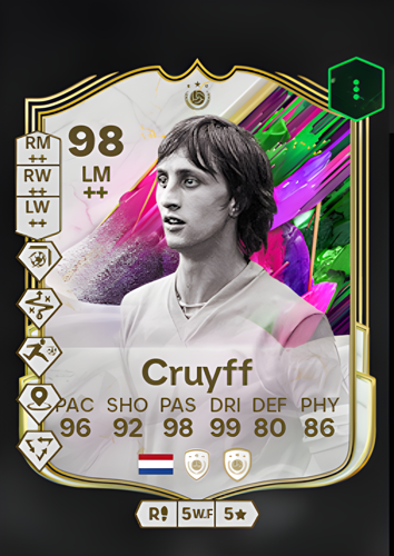 Johan Cruyff’s Icon card as a Left Midfielder boasts an outstanding overall rating of 98, making it one of the most coveted choices in the game. With blistering pace rated at 96, exceptional dribbling at 99, and a remarkable passing score of 98, Cruyff is perfectly suited to dominate the flanks and orchestrate attacks. His impressive shooting rating of 92 ensures he is a constant threat in front of goal, while his solid physicality at 86 and defense at 80 add valuable balance to his game. As a winger, this card’s blend of speed, creativity, and technical brilliance allows you to swiftly break down opposition defenses, create decisive opportunities, and secure crucial goals when it matters most.