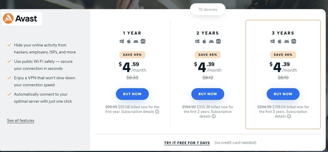 Avast sweetens the deal with a unique 7-day free trial requiring no payment details.