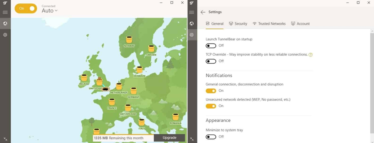 TunnelBear does offer unique advantages with its automatic WiFi protection feature that activates VPN connections on unsecured networks, plus Opera browser extension support. It's worth noting that TunnelBear's browser extensions only secure browser-based traffic rather than system-wide protection.