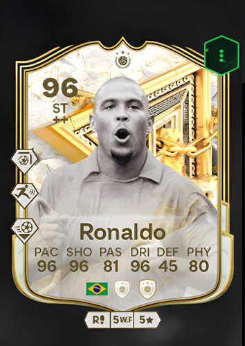 Ronaldo Luís Nazário de Lima’s Icon card stands out as a Striker with an exceptional overall rating of 96, boasting remarkable attributes that make him a formidable presence on the pitch. With blistering pace and clinical shooting, both rated at 96, alongside equally impressive dribbling, Ronaldo can glide past defenders and finish with lethal precision. His passing at 81 and physicality at 80 further enhance his versatility in attack, while a defense rating of 45 reflects his forward-focused role. As a striker, this card offers unparalleled advantages—his explosive speed and sharp finishing allow players to break through defensive lines effortlessly, capitalize on scoring opportunities, and decisively influence the outcome of any match.