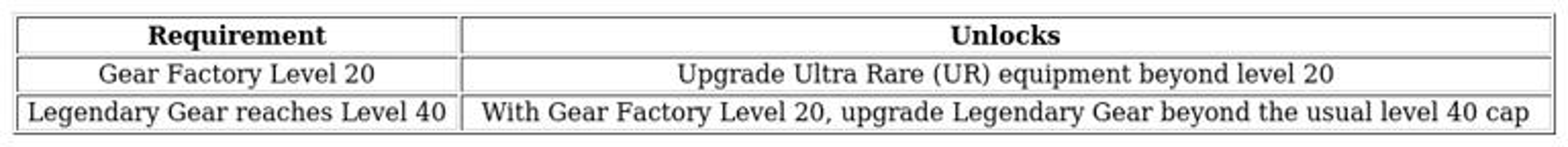To upgrade ultra-rare (UR) gear beyond level 20, your gear factory must be at least level 20. Achieving level 40 on legendary equipment, combined with a level 20 gear factory, enables you to surpass typical gear caps and unlock further potential.