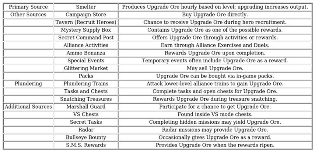 To maintain a steady supply of upgrade ore, participate actively in alliance events, limited-time activities, daily rewards, and resource plundering. Regular engagement ensures a continuous influx of vital materials.
