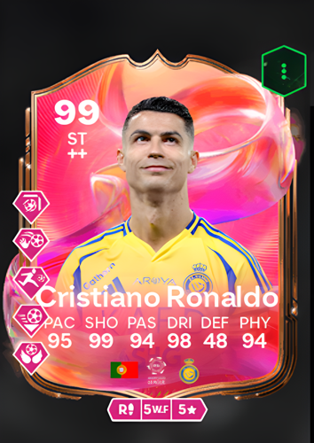C. Ronaldo dos Santos Aveiro's Futties card stands out as a Striker with an exceptional overall rating of 99, making him one of the most formidable forwards in the game. Boasting a blistering pace of 95, clinical shooting at 99, precise passing rated at 94, and remarkable dribbling at 98, this card is engineered for attacking dominance. With physicality at 94, Ronaldo can hold off defenders and maintain possession under pressure, while his lower defense rating of 48 emphasizes his focus on offense. As a striker, this card’s combination of speed, finishing, and technical skill enables players to break through defensive lines with ease, capitalize on scoring opportunities, and decisively influence the outcome of any match.
