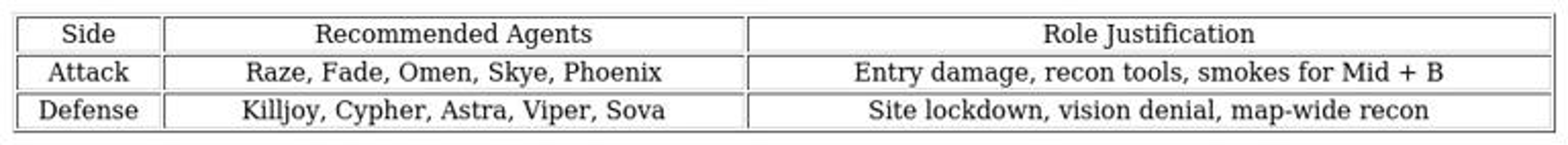 La communication entre joueurs est primordiale, en raison des rotations rapides possibles. Les agents sélectionnés incluent des capacités de recon, de contrôle de zone, de fumigènes et de flashes, indispensables pour s’adapter à la flux de la carte.