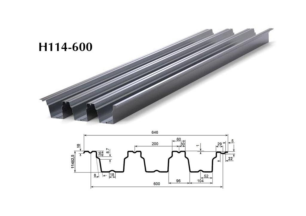 Его маркировка указывает на ключевые параметры: высота гофра 114 мм, общая ширина листа 646 мм и полезная монтажная ширина 600 мм. Уникальность этого профиля заключается в его конструкции, ориентированной на достижение максимальной локальной прочности и устойчивости к сверхнормативным нагрузкам.
