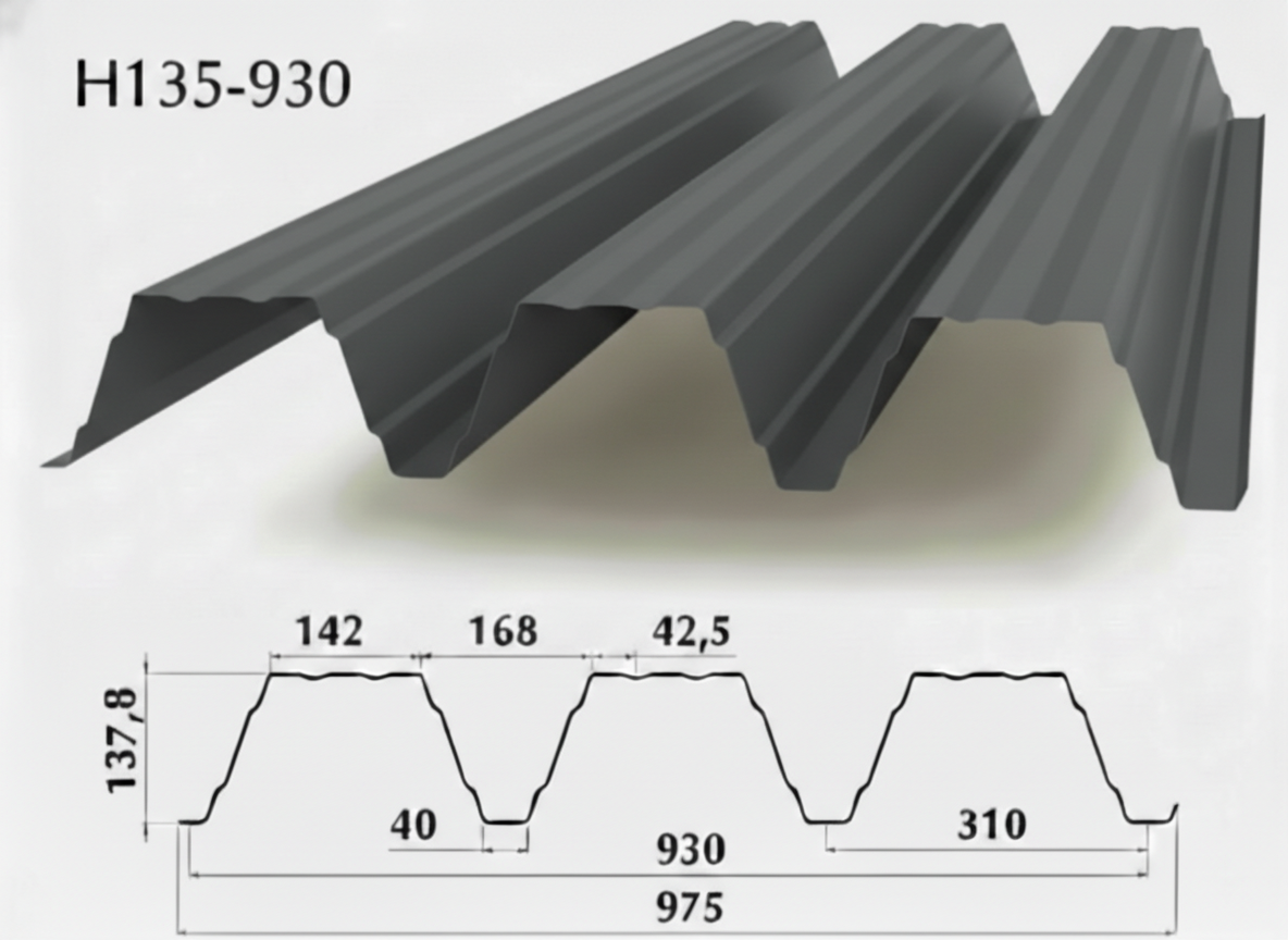 Тип профиля: Трапециевидный, высота ребра — 135 мм. Это вершина эволюции стандартных несущих профилей. Дальнейшее увеличение высоты требует перехода на специализированные штампованные элементы.