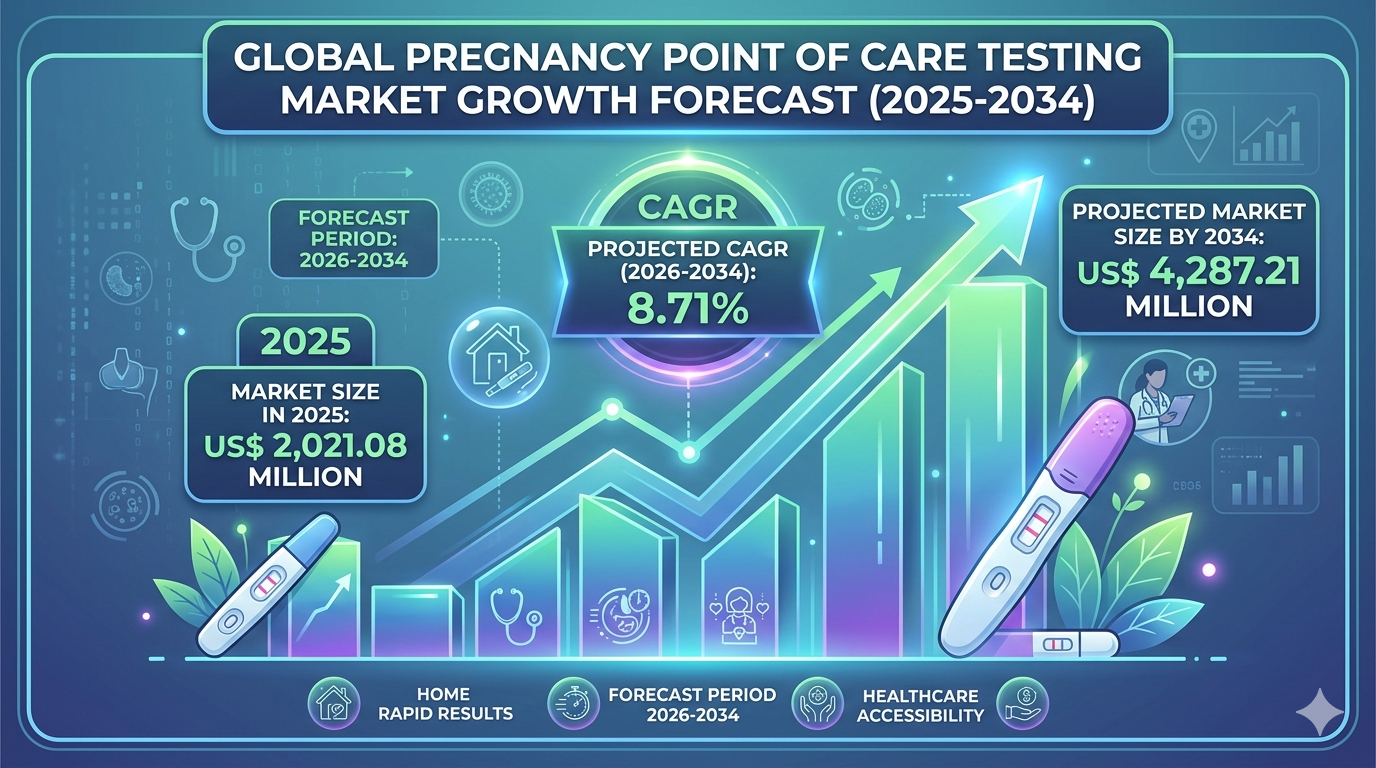 The global pregnancy point of care testing market size is projected to reach US$ 4,287.21 million by 2034 from US$ 2,021.08 million in 2025. The market is anticipated to register a CAGR of 8.71% during the forecast period 2026–2034. This growth is fueled by rising demand for rapid and convenient diagnostic solutions, increasing awareness of early pregnancy detection, and expanding healthcare infrastructure. The widespread availability of over-the-counter pregnancy testing kits and continuous improvements in product accuracy are further contributing to the sustained expansion of the industry.