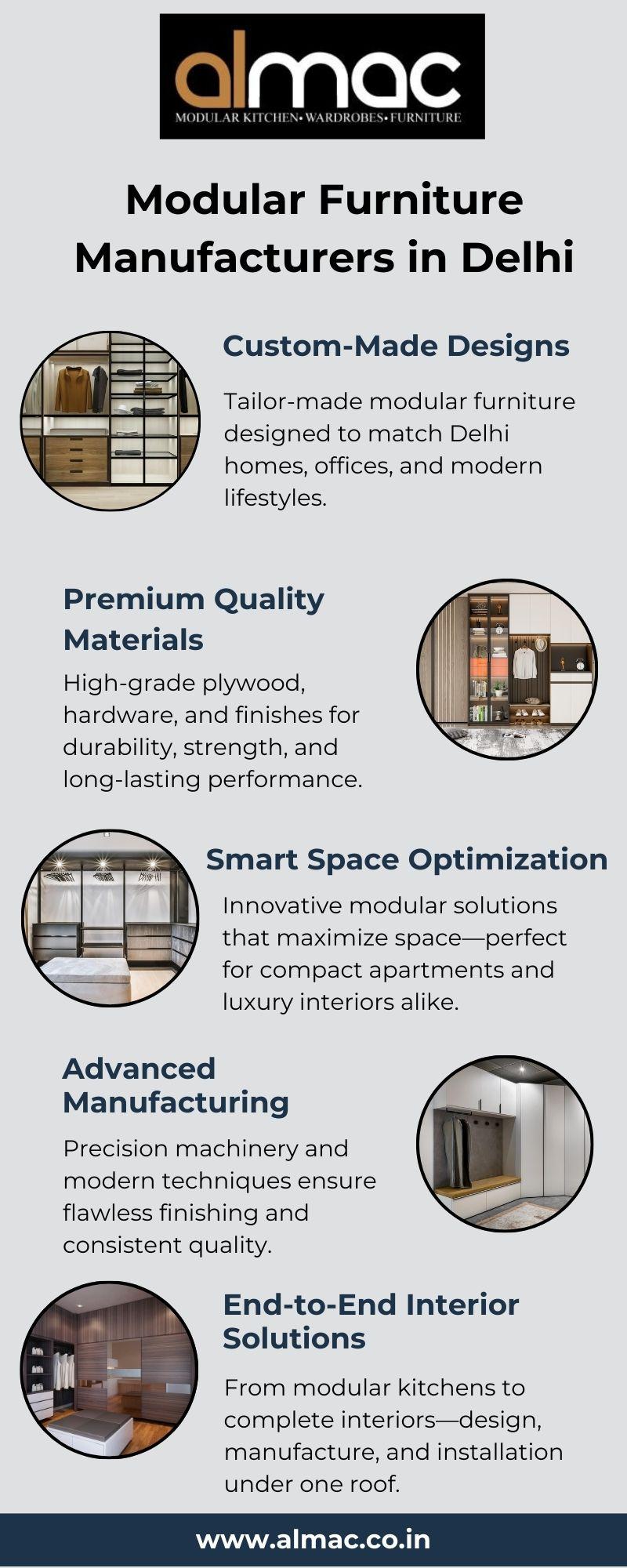 • Almac Modular Kitchens & Interiors is a Premium modular furniture manufacturer in Delhi, delivering custom-made designs, premium materials, smart space optimization, advanced manufacturing, and complete interior solutions for homes and offices with modern aesthetics and long-lasting quality.