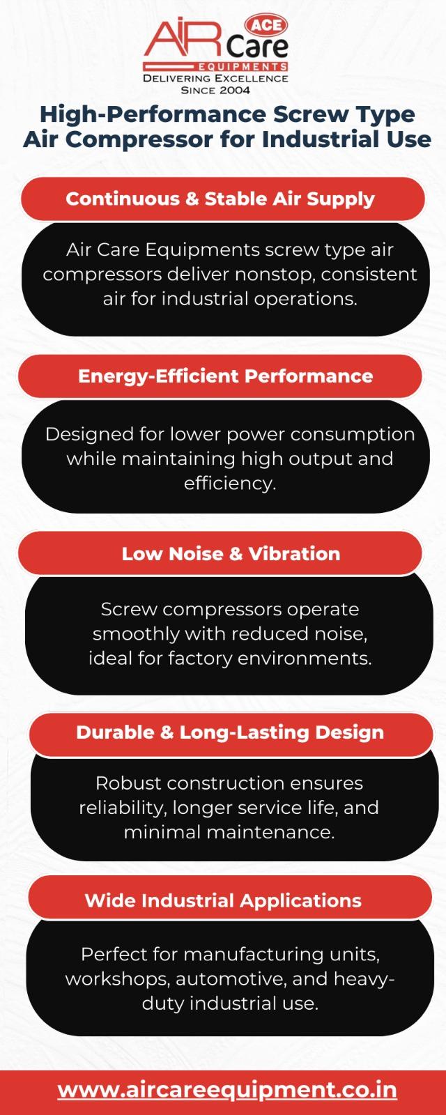 • Discover high-performance Screw Type Air Compressor solutions from Air Care Equipments. Designed for energy efficiency, durability, and continuous industrial operation, our compressors deliver reliable airflow with low maintenance costs. Ideal for manufacturing, automotive, and heavy-duty applications. Enhance productivity with advanced technology and trusted performance engineered for long-lasting results and superior efficiency.